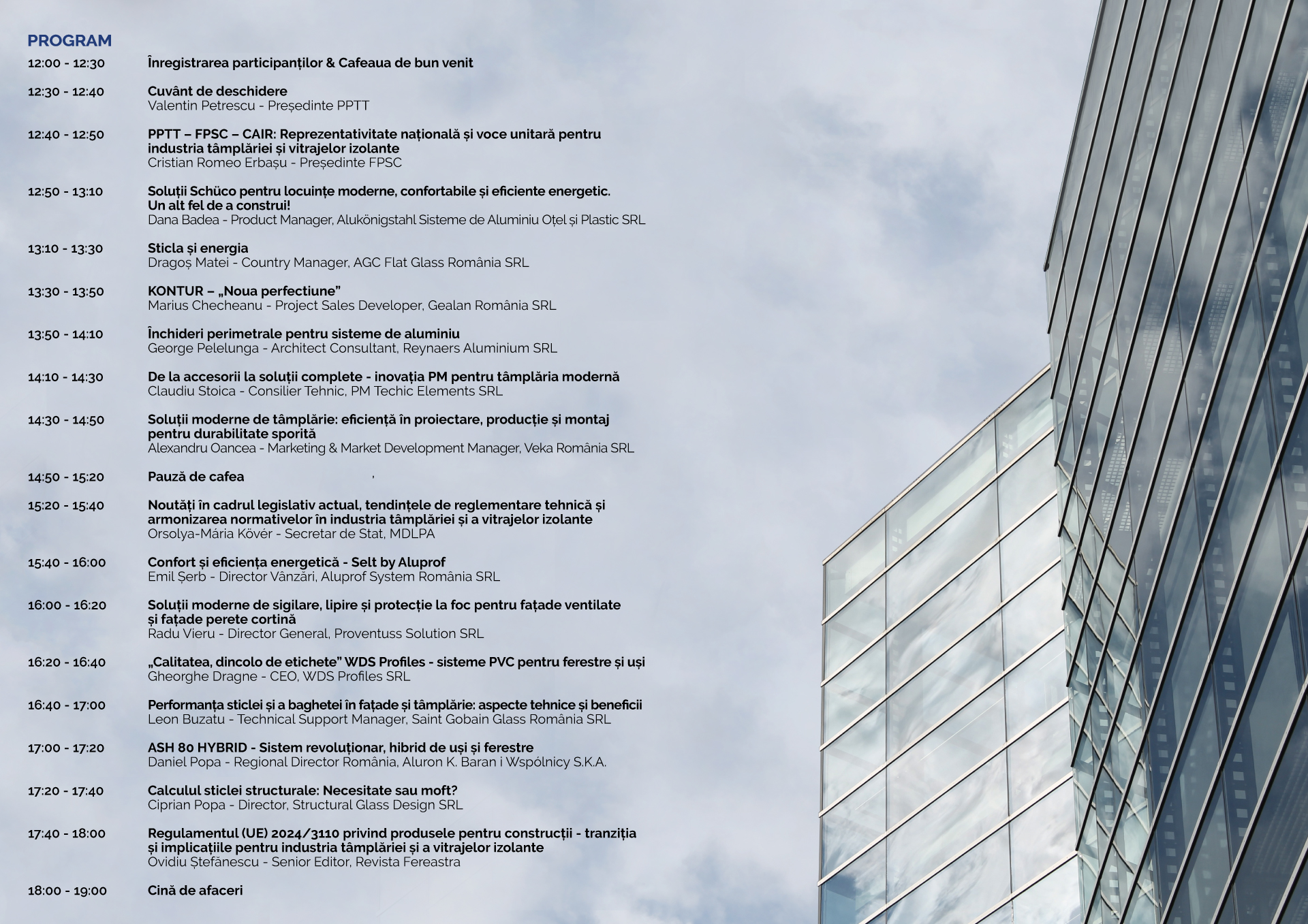 Vă așteptăm să fiți alături de noi la această nouă ediție, care continuă tradiția conferințelor PPTT dedicate dezvoltării profesionale, armonizării legislative și consolidării parteneriatelor din industria tâmplăriei termoizolante, pereților cortină, fațadelor ventilate și vitrajelor izolante.