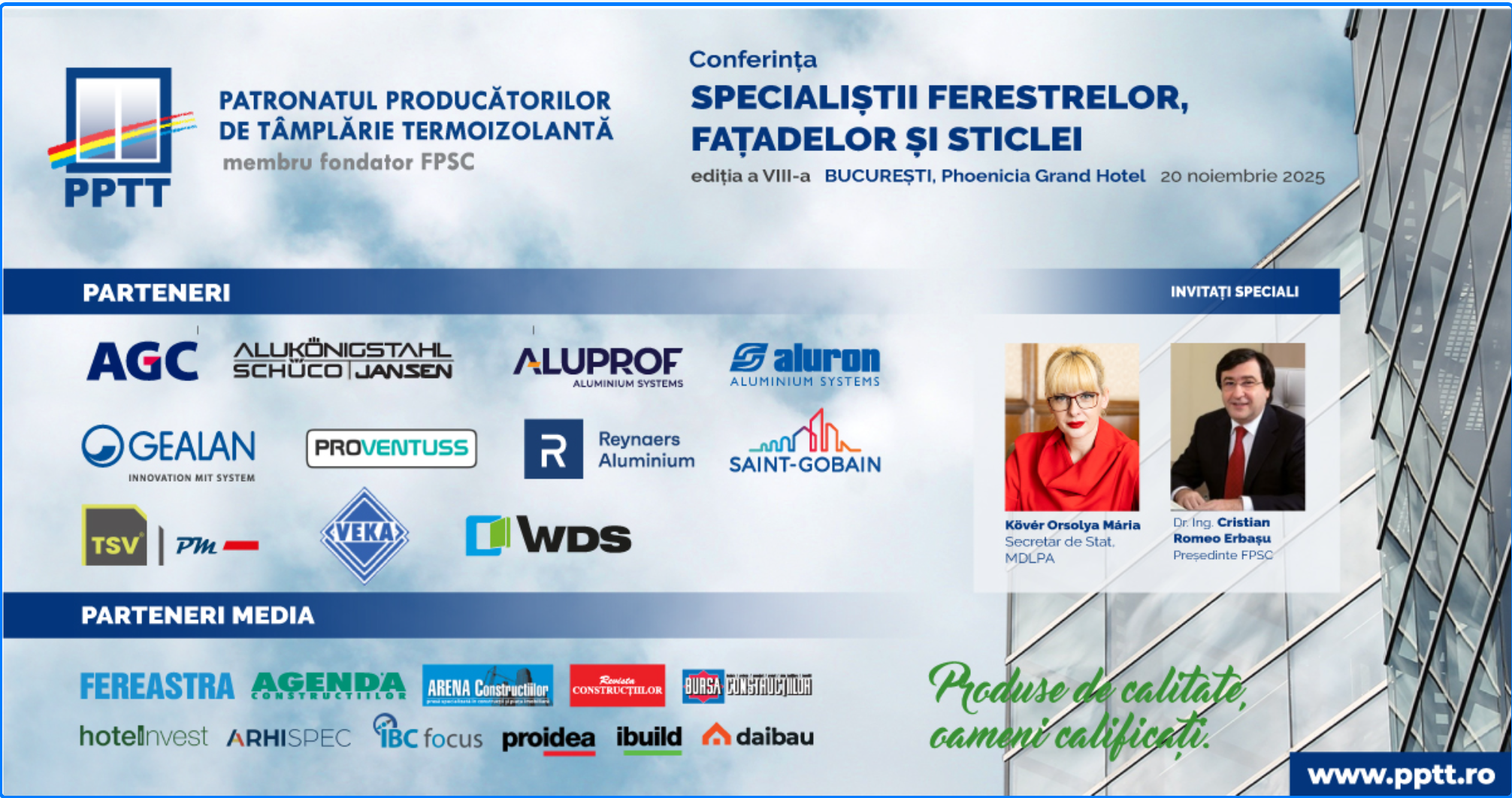 Vă așteptăm să fiți alături de noi la această nouă ediție, care continuă tradiția conferințelor PPTT dedicate dezvoltării profesionale, armonizării legislative și consolidării parteneriatelor din industria tâmplăriei termoizolante, pereților cortină, fațadelor ventilate și vitrajelor izolante.